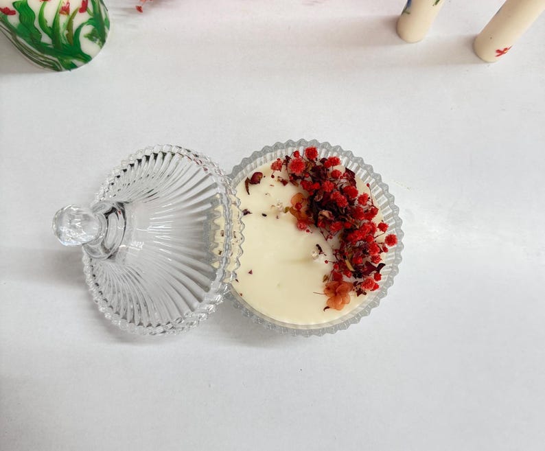 Botanical Soy Candle in Luxury Ribbed Glass Jar – Dried Flowers & Crystal Embeds – Handmade Gift for Her- Free Engraved Coaster